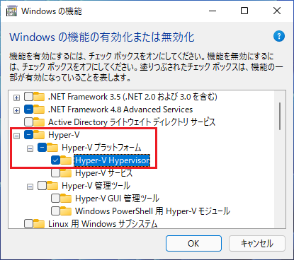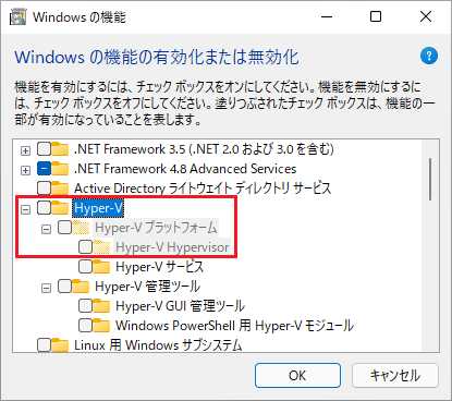 「Windowsの機能の有効化または無効化」ウィンドウ(ダイアログ)の、『Hyper-V Hypervisor』項目に、✔ が入れられない(灰色)状態となっています。