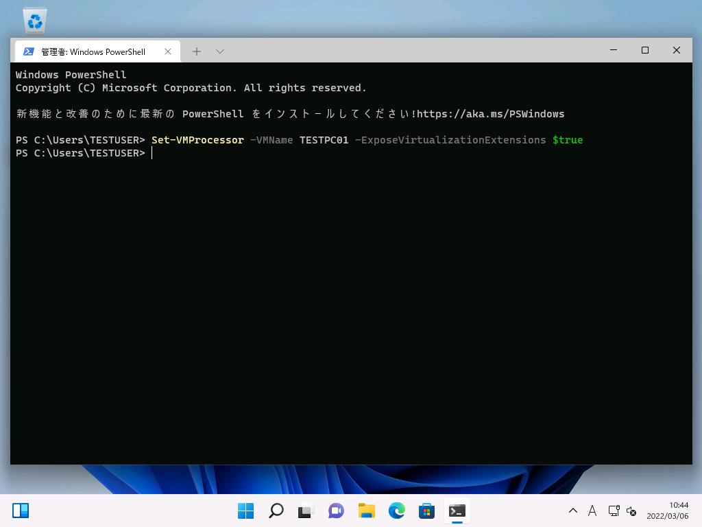 ① Set-VMProcessor -VMName TESTPC01 -ExposeVirtualizationExtensions $true