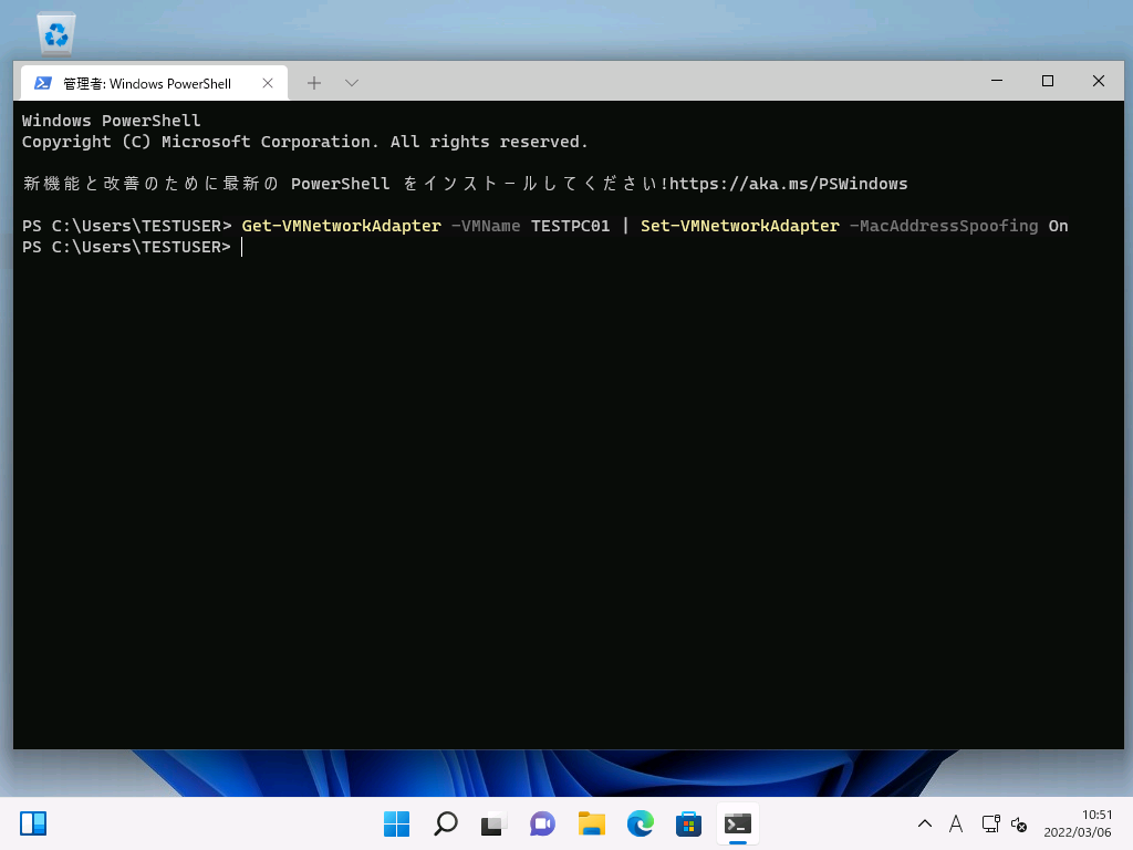 ② Get-VMNetworkAdapter -VMName TESTPC01 | Set-VMNetworkAdapter -MacAddressSpoofing On