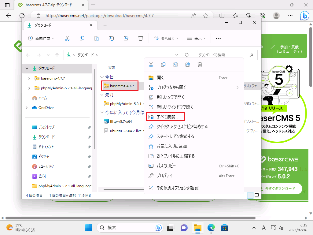 ダウンロードしたファイル「basercms-4.7.7」をマウス右クリック