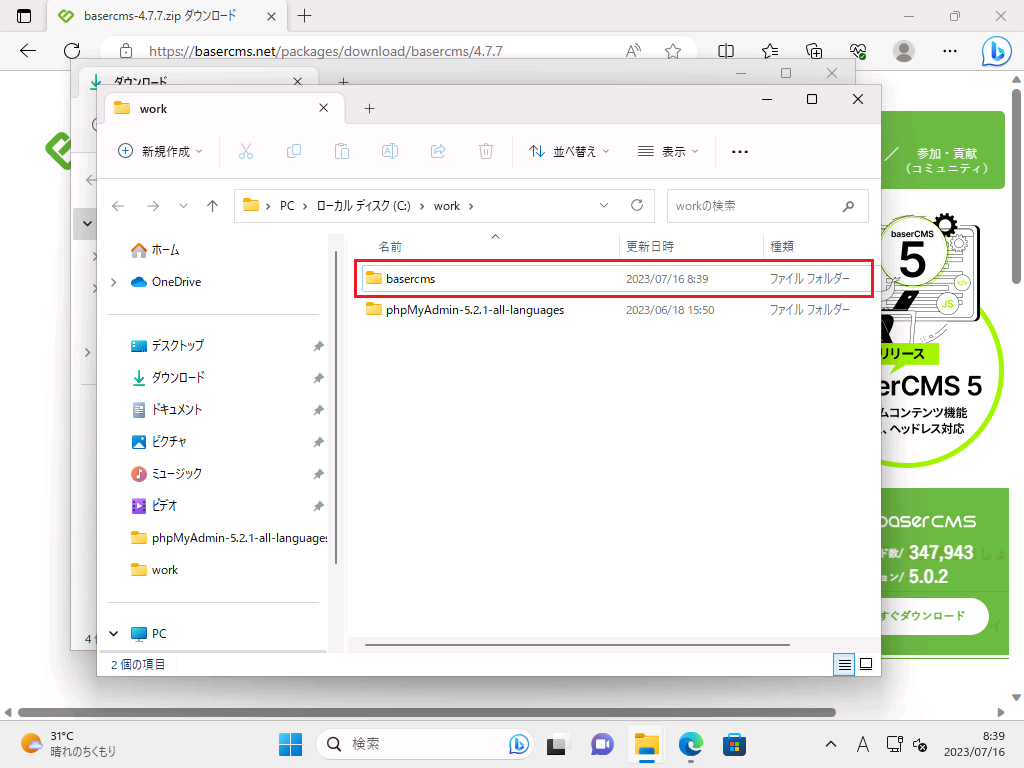 元 : c:¥work¥basercms (解凍したフォルダ)