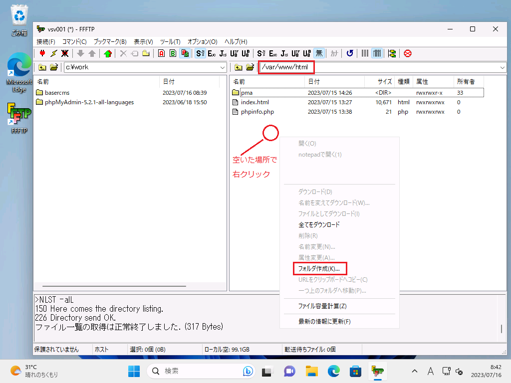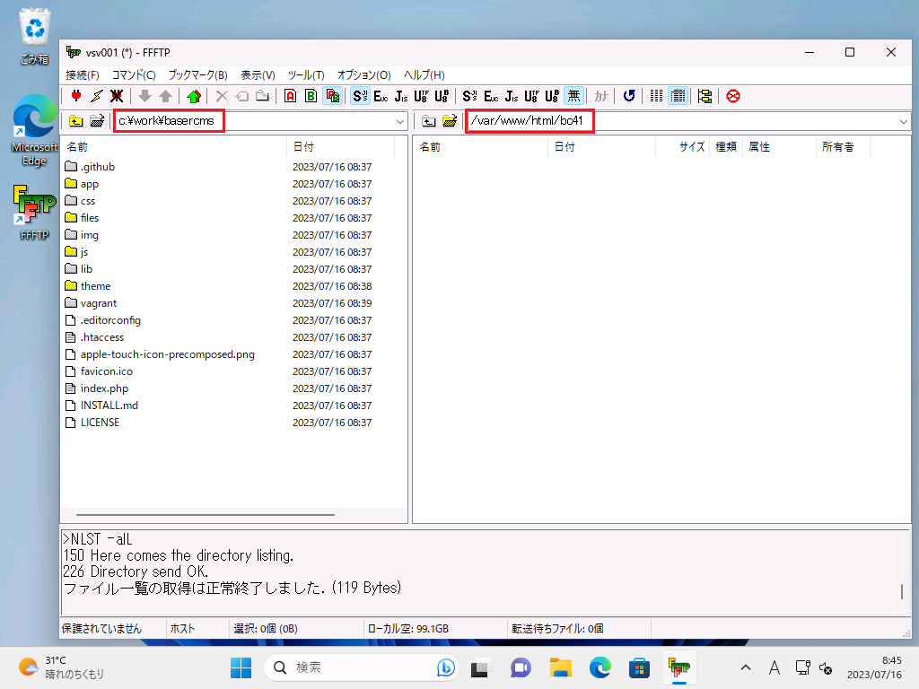 サーバー側(画面右側)のディレクトリパスが、/var/www/html となっている事を確認