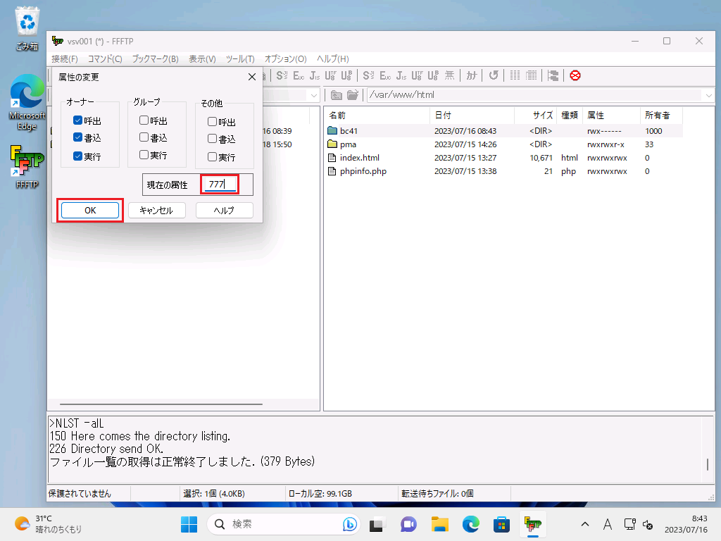 となっているので、属性(パーミッション)を変更する