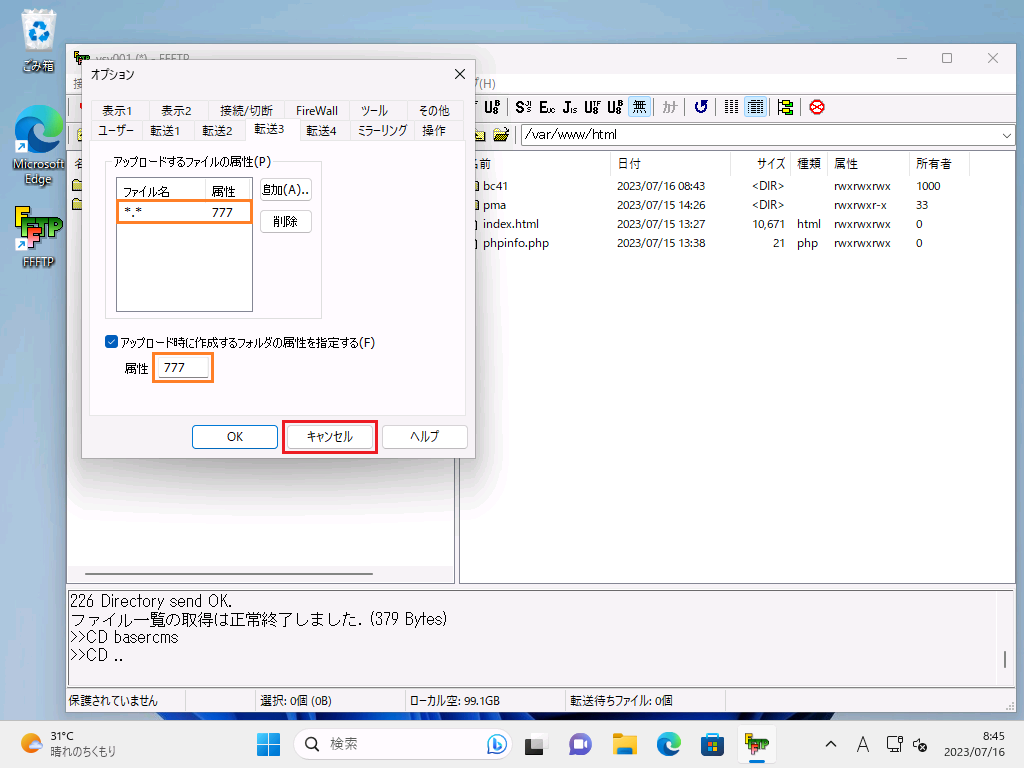 属性が、「777」 になっている事を確認し、「キャンセル」をマウス左クリック