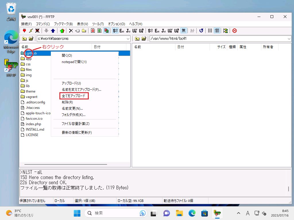 アップロード元のディレクトリ/ファイル(どこでもOK)をマウス右クリック