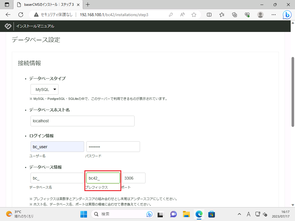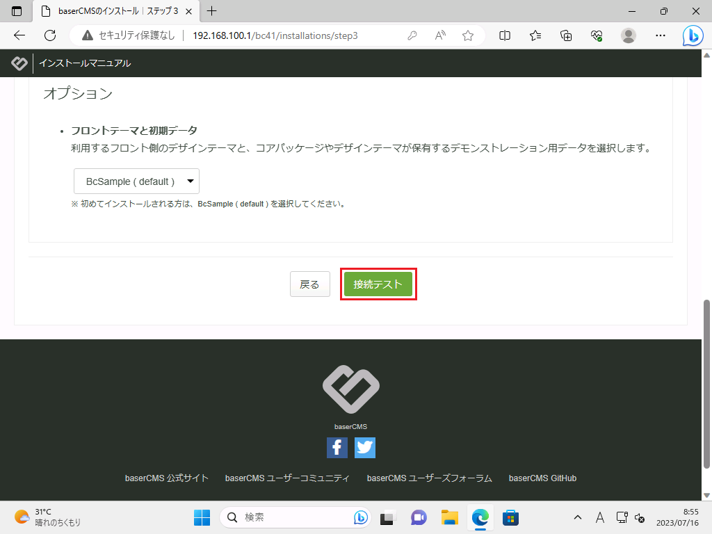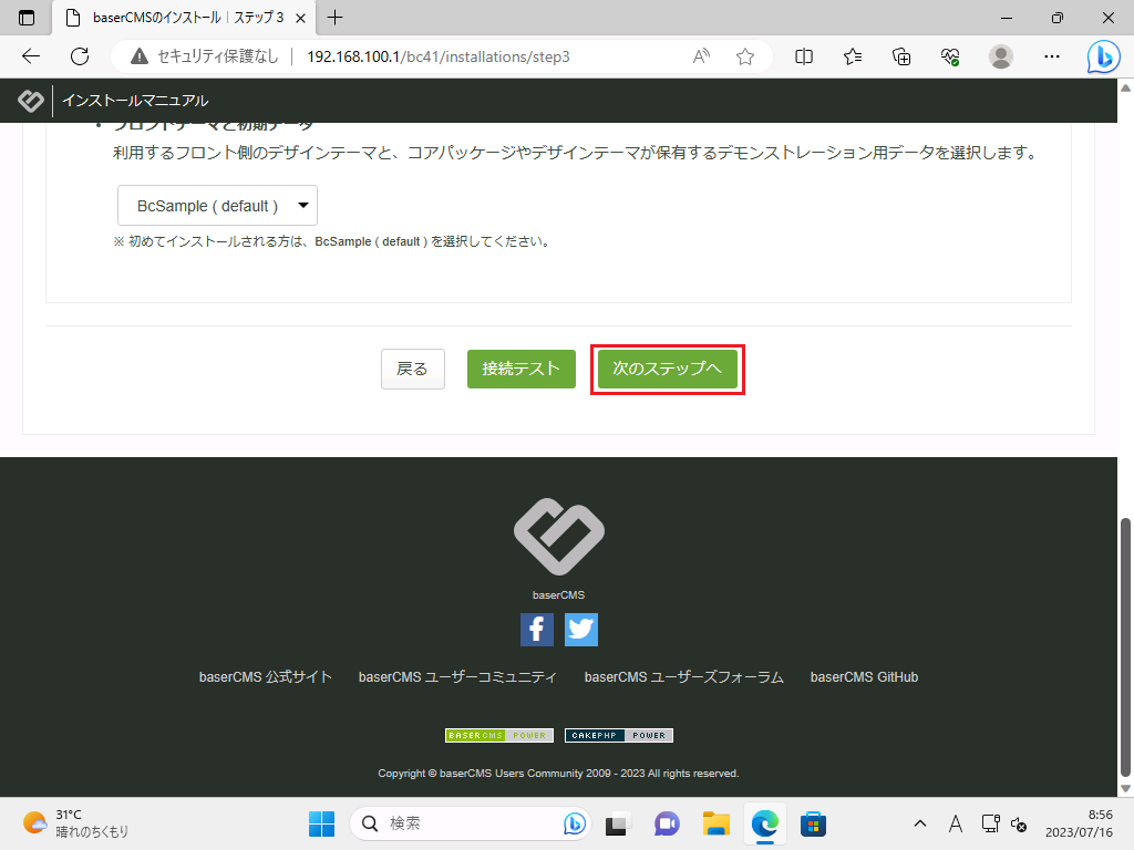 「baserCMSのインストール|ステップ3」画面に遷移