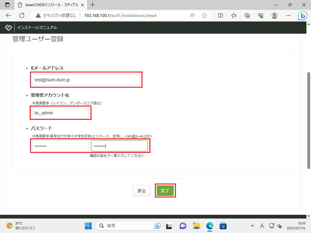 Eメールアドレスは、今回はテスト環境の為、メールサーバーを導入しておらず機能しない為、仮の登録となります。