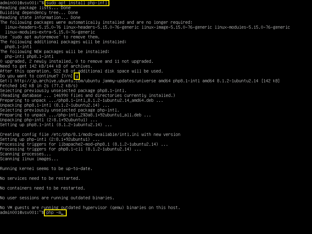 コマンド「sudo apt install php-xml」を入力し、「Enter」キーを押す