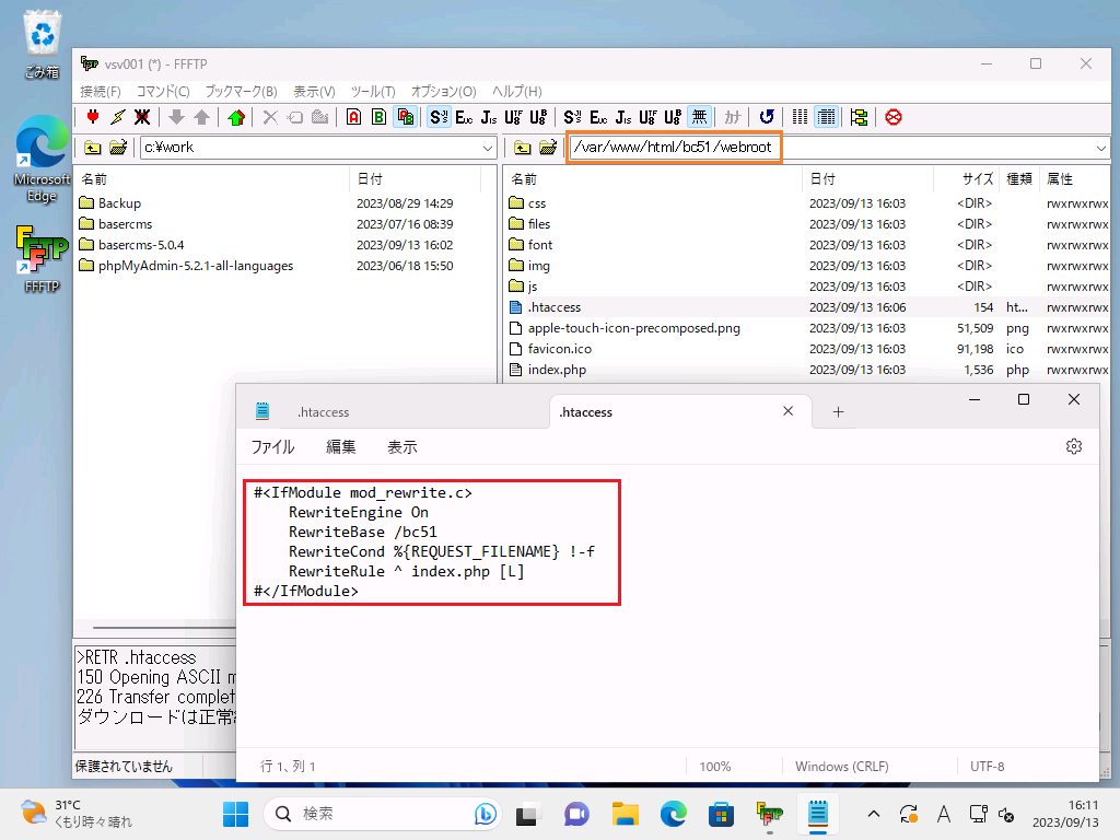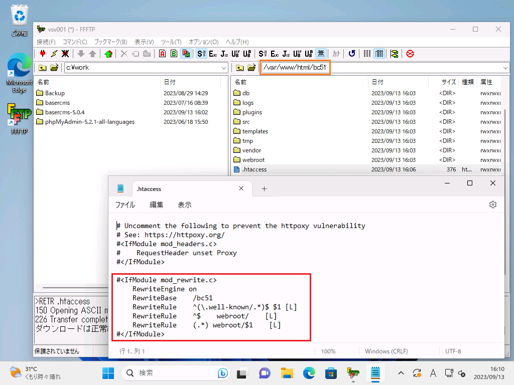 「.htaccess」ファイルは、「/var/www/html/bc51」「/var/www/html/bc51/webroot」の2ヶ所に在り、両方修正が必要でした。