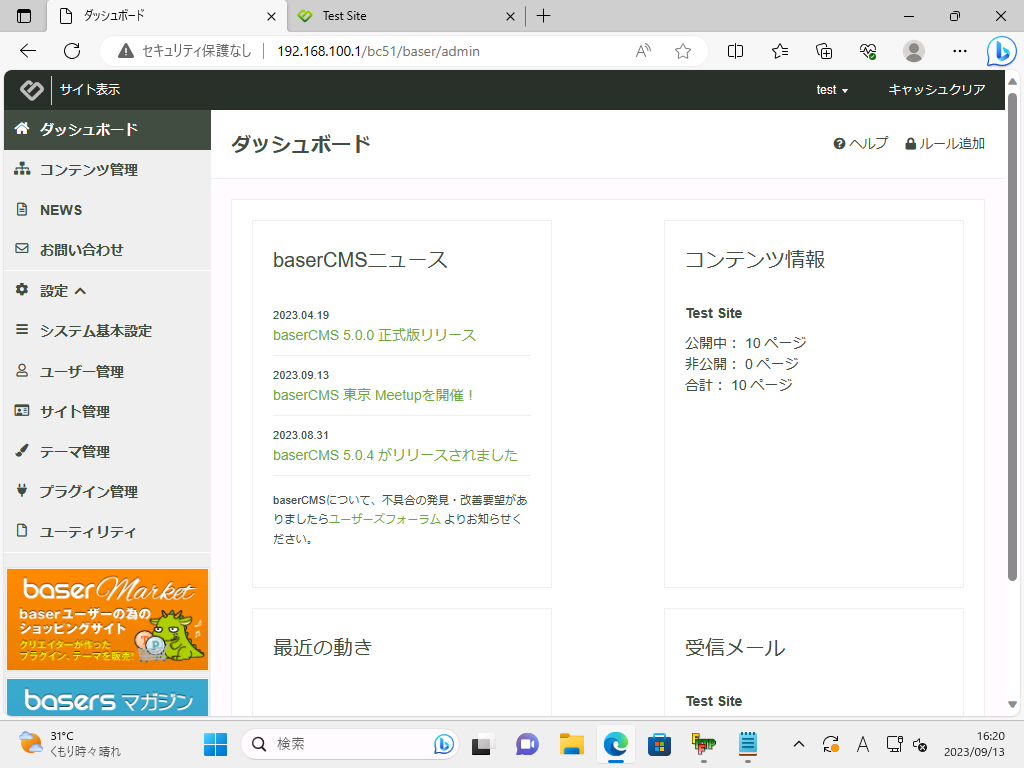 管理画面(ダッシュボード)のURLの階層が「/baser/admin」と、一段深くなっております。