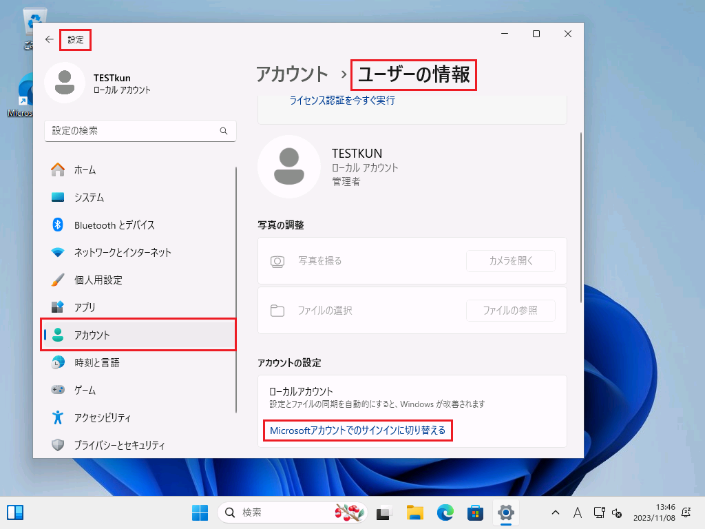 ローカルユーザーアカウント(オフラインアカウント)での設定ではどうでしょうか?