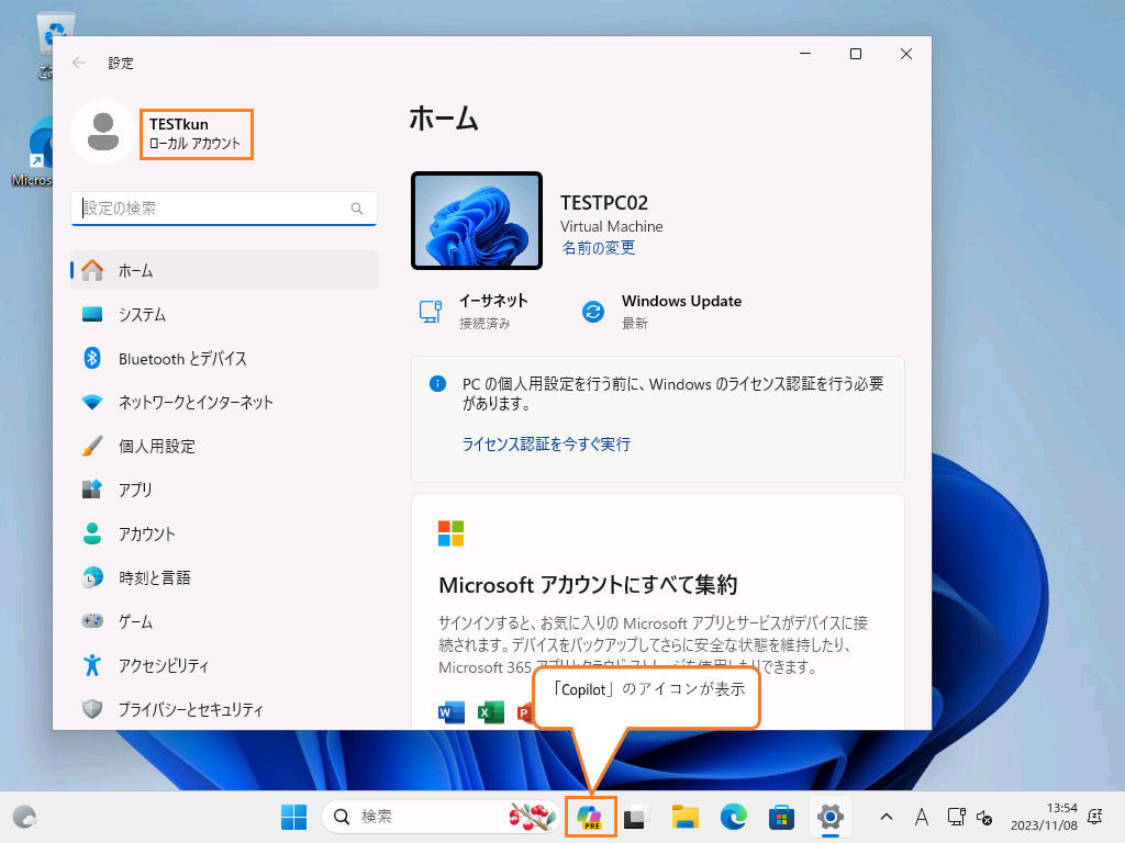 「ローカルユーザーアカウント」での「Copilot」の使用は、