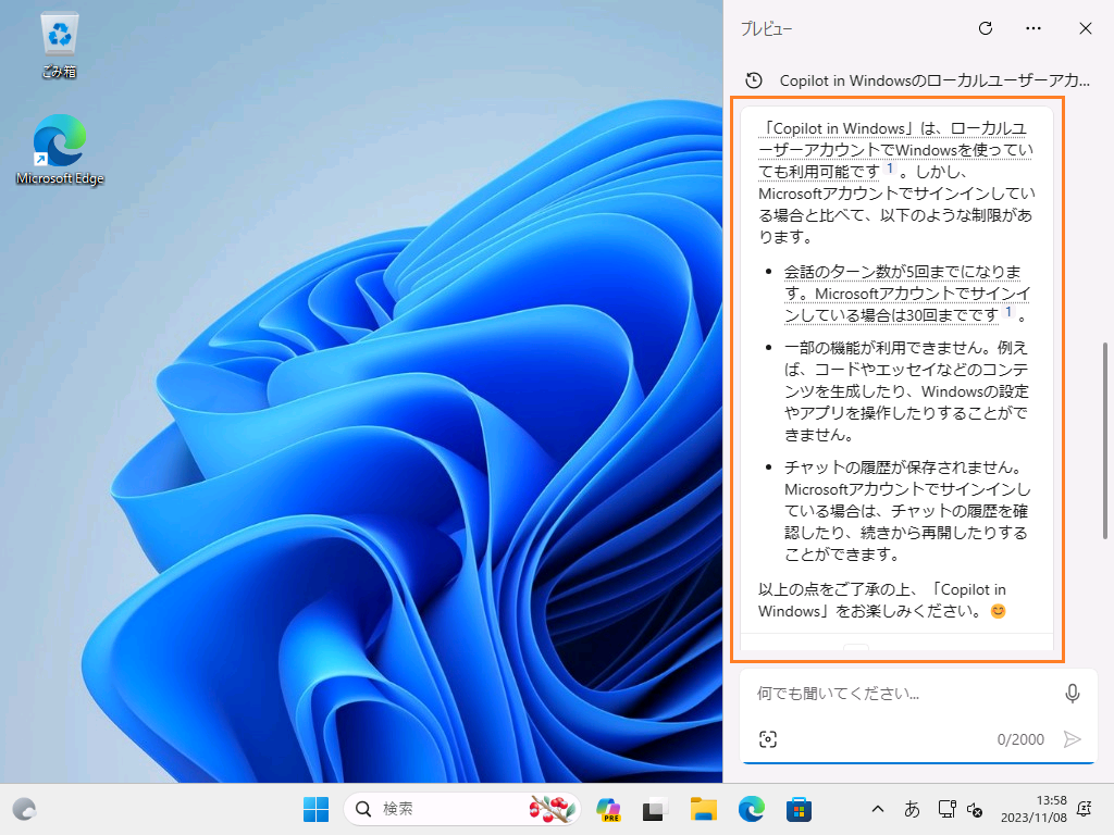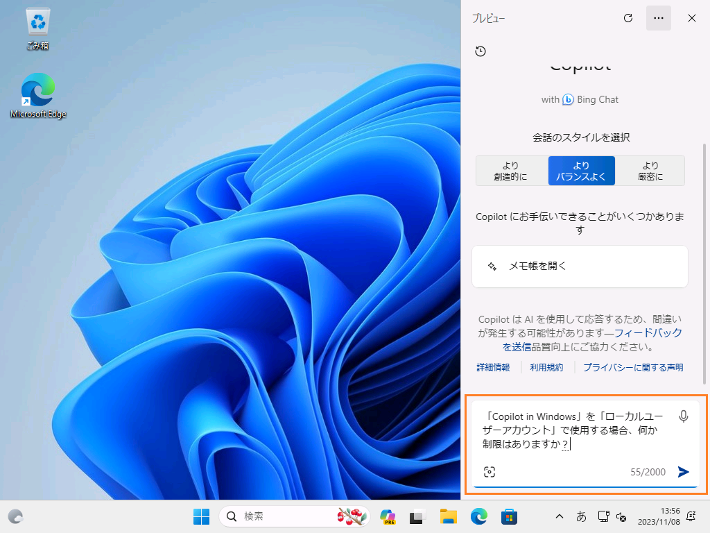 これで、「ローカルユーザーアカウント」で、「Copilot in Windows(Windows Copilot)」が使用可能となります。